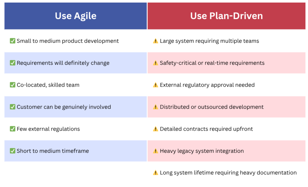 Here’s what the textbooks don’t always tell you: most successful large projects use hybrid approaches. They take the best from both worlds. This may mean using plan-driven approaches for requirements engineering and architecture, but agile practices during implementation, maintaining architectural documentation while minimizing detailed design docs, doing upfront planning for team coordination while allowing teams to self-organize internally, creating just enough documentation for contracts and compliance whilst keeping it minimal, and more. At the end of the day, it is key to choose or formulate a process that best suits the nature of your project.